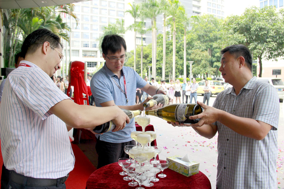 在庆功典礼上,董事长刘伟,副总裁顾友良,助理总裁、智能安防(广东)事业部总经理刘斌共同开启香槟庆祝